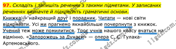 Складіть і запишіть речення з такими підметами. У записаних реченнях визначте й підкресліть граматичні основи. Книжка — найкращий друг і порадник. Читати — нові світи відкривати. Усі ми прагнемо якнайбільше почерпнути з книжок. Учений теж може помилитися. Троє учнів нашого класу вчаться на відмінно. «Запорожець за Дунаєм» — опера С. С. Гулака-Артемовського.