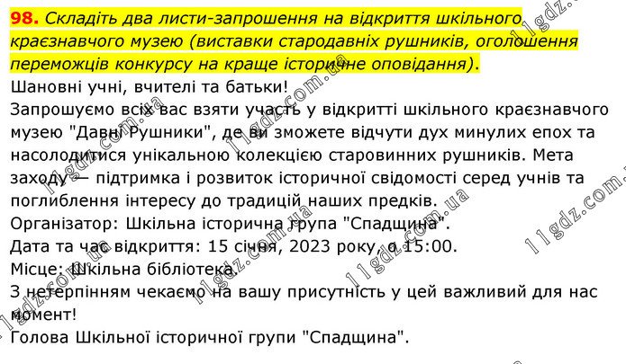 Складіть два листи-запрошення на відкриття шкільного краєзнавчого музею (виставки стародавніх рушників, оголошення переможців конкурсу на краще історичне оповідання). Шановні учні, вчителі та батьки! Запрошуємо всіх вас взяти участь у відкритті шкільного краєзнавчого музею "Давні Рушники", де ви зможете відчути дух минулих епох та насолодитися унікальною колекцією старовинних рушників. Мета заходу — підтримка і розвиток історичної свідомості серед учнів та поглиблення інтересу до традицій наших предків. Організатор: Шкільна історична група "Спадщина". Дата та час відкриття: 15 січня, 2023 року, о 15:00. Місце: Шкільна бібліотека. З нетерпінням чекаємо на вашу присутність у цей важливий для нас момент! Голова Шкільної історичної групи "Спадщина".