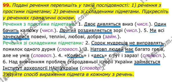 Подані речення перепишіть у такій послідовності: 1) речення з простими підметами; 2) речення зі складеними підметами. Підкресліть у реченнях граматичні основи. Речення з простими підметами: 1. Двоє дивляться вниз (числ.). Один бачить калюжу (числ.). Другий роздивляється зорі (числ.). 5. Ми всі зачекалися повені, тепліні, любові, добра (займ.). Речення зі складеними підметами: 2. Сорок мудреців не виправлять помилок одного дурня (словосп.). 3. Натовп людей має багато голів, але не умів (словосп.). 4. «Колись» і «десь» є тут і зараз! (словосп.). 6. Над вивченням проблем стародавньої історії України займається Інститут археології НАН України (словосп.). З’ясуйте спосіб вираження підмета в кожному з речень.