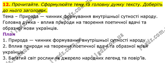 Прочитайте. Сформулюйте тему та головну думку тексту. Доберіть до нього заголовок. Тема – Природа — чинник формування внутрішньої сутності народу. Головна думка - вплив природи на творення поетичної вдачі та образної мови українців. План 1. Природа — чинник формування внутрішньої сутності народу. 2. Вплив природи на творення поетичної вдачі та образної мови українців. 3. Багатий світ рослин як джерело народних легенд та повір’їв.