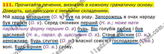 Прочитайте речення, визначте в кожному граматичну основу. Доведіть, що присудки є іменними складеними. Мій народ козацьким (О. в) був од роду. Запорожець в очах народу був героєм (О. в). Серед сміливих перший (Н. в.; може мати паралельну форму першим О. в) будь. Він голубів любив і був щасливий (Н. в., парал. ф. щасливим О. в). Стане дійсним (О. в.) неможливе. Будь слугою (О. в.) власної совісті і господарем (О. в.) волі. Будь вірним (О. в.) слову.