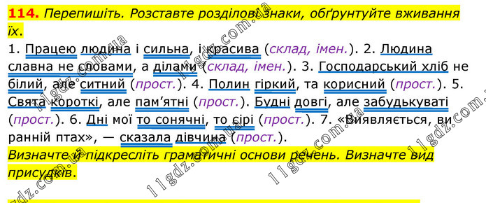 Перепишіть. Розставте розділові знаки, обґрунтуйте вживання їх. 1. Працею людина і сильна, і красива (склад, імен.). 2. Людина славна не словами, а ділами (склад, імен.). 3. Господарський хліб не білий, але ситний (прост.). 4. Полин гіркий, та корисний (прост.). 5. Свята короткі, але пам’ятні (прост.). Будні довгі, але забудькуваті (прост.). 6. Дні мої то сонячні, то сірі (прост.). 7. «Виявляється, ви ранній птах», — сказала дівчина (прост.). Визначте й підкресліть граматичні основи речень. Визначте вид присудків.
