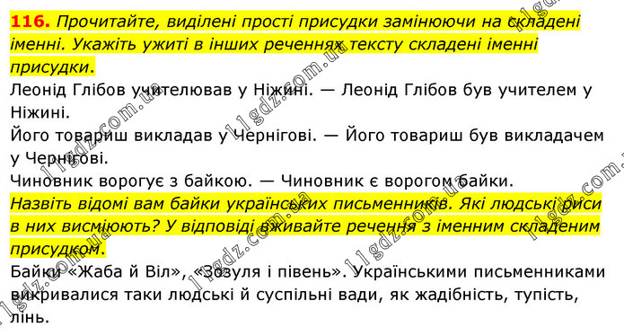 Прочитайте, виділені прості присудки замінюючи на складені іменні. Укажіть ужиті в інших реченнях тексту складені іменні присудки. Леонід Глібов учителював у Ніжині. — Леонід Глібов був учителем у Ніжині. Його товариш викладав у Чернігові. — Його товариш був викладачем у Чернігові. Чиновник ворогує з байкою. — Чиновник є ворогом байки. Назвіть відомі вам байки українських письменників. Які людські риси в них висміюють? У відповіді вживайте речення з іменним складеним присудком. Байки «Жаба й Віл», «Зозуля і півень». Українськими письменниками викривалися таки людські й суспільні вади, як жадібність, тупість, лінь.