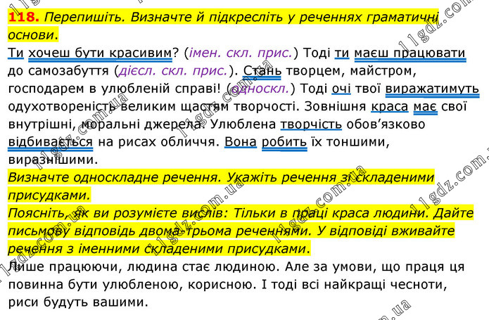 Перепишіть. Визначте й підкресліть у реченнях граматичні основи. Ти хочеш бути красивим? (імен. скл. прис.) Тоді ти маєш працювати до самозабуття (дієсл. скл. прис.). Стань творцем, майстром, господарем в улюбленій справі! (односкл.) Тоді очі твої виражатимуть одухотвореність великим щастям творчості. Зовнішня краса має свої внутрішні, моральні джерела. Улюблена творчість обов’язково відбивається на рисах обличчя. Вона робить їх тоншими, виразнішими. Визначте односкладне речення. Укажіть речення зі складеними присудками. Поясніть, як ви розумієте вислів: Тільки в праці краса людини. Дайте письмову відповідь двома-трьома реченнями. У відповіді вживайте речення з іменними складеними присудками. Лише працюючи, людина стає людиною. Але за умови, що праця ця повинна бути улюбленою, корисною. І тоді всі найкращі чесноти, риси будуть вашими.