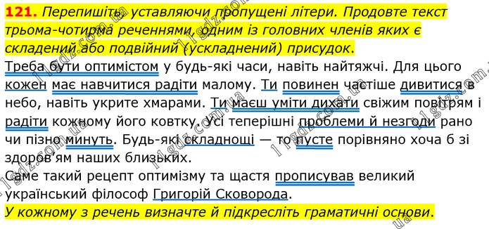Перепишіть, уставляючи пропущені літери. Продовте текст трьома-чотирма реченнями, одним із головних членів яких є складений або подвійний (ускладнений) присудок. Треба бути оптимістом у будь-які часи, навіть найтяжчі. Для цього кожен має навчитися радіти малому. Ти повинен частіше дивитися в небо, навіть укрите хмарами. Ти маєш уміти дихати свіжим повітрям і радіти кожному його ковтку. Усі теперішні проблеми й незгоди рано чи пізно минуть. Будь-які складнощі — то пусте порівняно хоча б зі здоров’ям наших близьких. Саме такий рецепт оптимізму та щастя прописував великий український філософ Григорій Сковорода. У кожному з речень визначте й підкресліть граматичні основи.