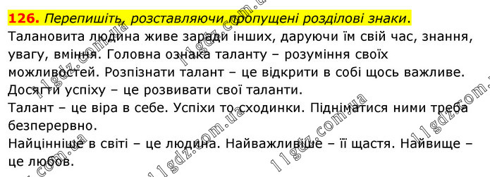 Перепишіть, розставляючи пропущені розділові знаки. Талановита людина живе заради інших, даруючи їм свій час, знання, увагу, вміння. Головна ознака таланту – розуміння своїх можливостей. Розпізнати талант – це відкрити в собі щось важливе. Досягти успіху – це розвивати свої таланти. Талант – це віра в себе. Успіхи то сходинки. Підніматися ними треба безперервно. Найцінніше в світі – це людина. Найважливіше – її щастя. Найвище – це любов.