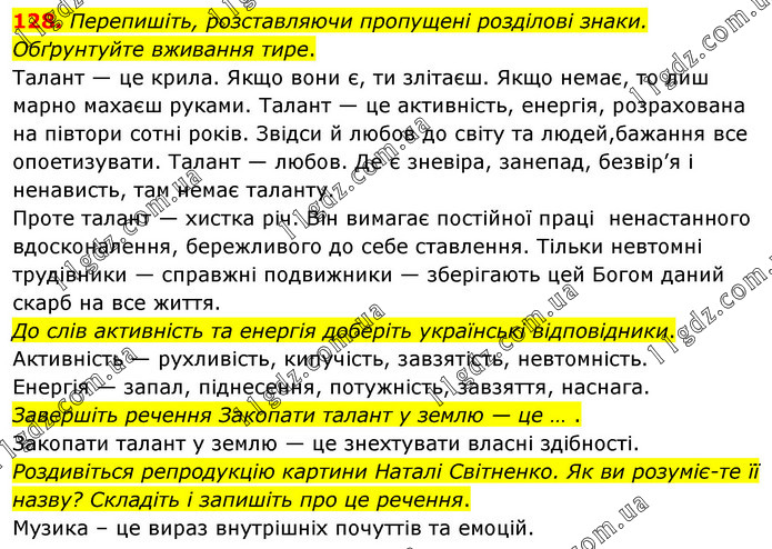 Перепишіть, розставляючи пропущені розділові знаки. Обґрунтуйте вживання тире. Талант — це крила. Якщо вони є, ти злітаєш. Якщо немає, то лиш марно махаєш руками. Талант — це активність, енергія, розрахована на півтори сотні років. Звідси й любов до світу та людей,бажання все опоетизувати. Талант — любов. Де є зневіра, занепад, безвір’я і ненависть, там немає таланту. Проте талант — хистка річ. Він вимагає постійної праці ненастанного вдосконалення, бережливого до себе ставлення. Тільки невтомні трудівники — справжні подвижники — зберігають цей Богом даний скарб на все життя. До слів активність та енергія доберіть українські відповідники. Активність — рухливість, кипучість, завзятість, невтомність. Енергія — запал, піднесення, потужність, завзяття, наснага. Завершіть речення Закопати талант у землю — це … . Закопати талант у землю — це знехтувати власні здібності. Роздивіться репродукцію картини Наталі Світненко. Як ви розуміє-те її назву? Складіть і запишіть про це речення. Музика – це вираз внутрішніх почуттів та емоцій.