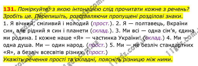 Поміркуйте: з якою інтонацією слід прочитати кожне з речень? Зробіть це. Перепишіть, розставляючи пропущені розділові знаки. 1. Я вічний, сміливий і молодий (прост.). 2. Я — полтавець, Вкраїни син, але рідний я син і планети (склад.). 3. Ми всі — одна сім’я, єдина ми родина. І кожне наше «Я» — частинка України! (склад.) 4. Ми — одна душа. Ми — один народ. (прост.) 5. Ми — не безліч стандартних «Я», а безліч всесвітів різних. (прост.) Укажіть речення прості та складні, поясніть різницю між ними.