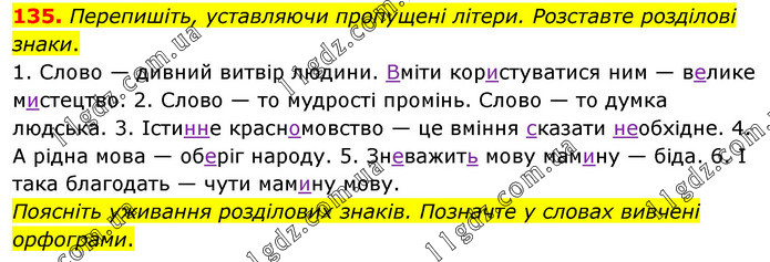 Перепишіть, уставляючи пропущені літери. Розставте розділові знаки. 1. Слово — дивний витвір людини. Вміти користуватися ним — велике мистецтво. 2. Слово — то мудрості промінь. Слово — то думка людська. 3. Істинне красномовство — це вміння сказати необхідне. 4. А рідна мова — оберіг народу. 5. Зневажить мову мамину — біда. 6. І така благодать — чути мамину мову. Поясніть уживання розділових знаків. Позначте у словах вивчені орфограми.