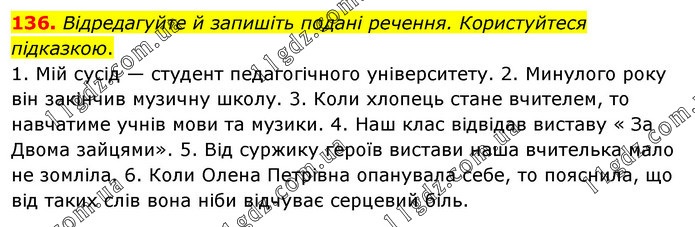 Відредагуйте й запишіть подані речення. Користуйтеся підказкою. 1. Мій сусід — студент педагогічного університету. 2. Минулого року він закінчив музичну школу. 3. Коли хлопець стане вчителем, то навчатиме учнів мови та музики. 4. Наш клас відвідав виставу « За Двома зайцями». 5. Від суржику героїв вистави наша вчителька мало не зомліла. 6. Коли Олена Петрівна опанувала себе, то пояснила, що від таких слів вона ніби відчуває серцевий біль.