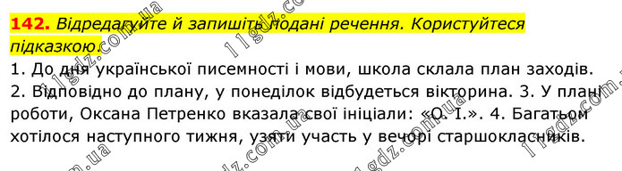 Відредагуйте й запишіть подані речення. Користуйтеся підказкою. 1. До дня української писемності і мови, школа склала план заходів. 2. Відповідно до плану, у понеділок відбудеться вікторина. 3. У плані роботи, Оксана Петренко вказала свої ініціали: «О. І.». 4. Багатьом хотілося наступного тижня, узяти участь у вечорі старшокласників.