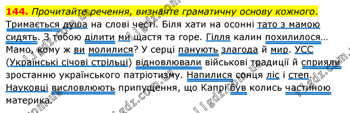 Прочитайте речення, визначте граматичну основу кожного. Тримається душа на слові честі. Біля хати на осонні тато з мамою сидять. З тобою ділити ми щастя та горе. Гілля калин похилилося… Мамо, кому ж ви молилися? У серці панують злагода й мир. УСС (Українські січові стрільці) відновлювали військові традиції й сприяли зростанню українського патріотизму. Напилися сонця ліс і степ. Науковці висловлюють припущення, що Капрі був колись частиною материка.