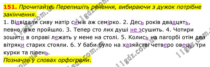 Прочитайте. Перепишіть речення, вибираючи з дужок потрібне закінчення. 1. Відвідали сиву матір синів аж семірко. 2. Десь років двадцять, певно, вже пройшло. 3. Тепер сто лих душі не зсушить. 4. Чотири зошити в оправі лежать у мене на столі. 5. Колись на пагорбі отім два вітряки старих стояли. 6. У баби було на хазяйстві четверо овець, три курки та півень. Позначте у словах орфограми.