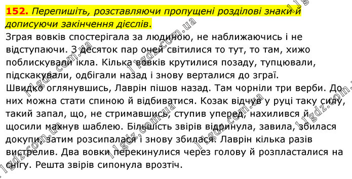Перепишіть, розставляючи пропущені розділові знаки й дописуючи закінчення дієслів. Зграя вовків спостерігала за людиною, не наближаючись і не відступаючи. З десяток пар очей світилися то тут, то там, хижо поблискували ікла. Кілька вовків крутилися позаду, тупцювали, підскакували, одбігали назад і знову верталися до зграї. Швидко оглянувшись, Лаврін пішов назад. Там чорніли три верби. До них можна стати спиною й відбиватися. Козак відчув у руці таку силу, такий запал, що, не стримавшись, ступив уперед, нахилився й щосили махнув шаблею. Більшість звірів відринула, завила, збилася докупи, затим розсипалася і знову збилася. Лаврін кілька разів вистрелив. Два вовки перекинулися через голову й розпласталися на снігу. Решта звірів сипонула врозтіч.