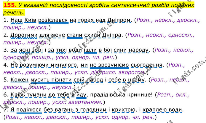 У вказаній послідовності зробіть синтаксичний розбір поданих речень. 1. Наш Київ розіслався на горах над Дніпром. (Розп., неокл., двоскл., пошир., неускл.) 2. Дорогими для мене стали схили Дніпра. (Розп., неокл., односкл., пошир., неускл.) 3. За ясні зорі і за тихі води ішли в бої сини народу. (Розп., неокл., односкл., пошир., ускл. однор. чл. реч.) 4. Не розуміючи минулого, ми не зрозуміємо сьогодення. (Розп., неокл., двоскл., пошир., ускл. дієприсл. зворотом.) 5. Кожен мусить пізнати свій народ і себе в ньому. (Розп., неокл., двоскл., пошир., неускл.) 6. Крізь тумани до тебе я йду, прадідівська кринице! (Розп., окл., двоскл., пошир., ускл. звертанням.) 7. Я поділюся без вагань з голодним і крихтою, і краплею води. (Розп., неокл., двоскл., пошир., ускл. однор. чл. реч.)