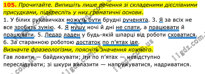 Прочитайте. Випишіть лише речення зі складеними дієслівними присудками, підкресліть у них граматичні основи. 1. У білих рукавичках можуть бути брудні рученята. 3. Я за всіх не все зробить зумію. 4. Я мушу ночі й дні не спати, а працювати й працювати. 5. Ледар ладен у будь-якій шпарці від роботи сховатися. 6. За старанною роботою достаток по п’ятах іде. Визначте фразеологізми, поясніть значення кожного. Гав ловити — байдикувати; іти по п’ятах — невідступно переслідувати; зі шкури вилазити — напружуватися, надриватися.