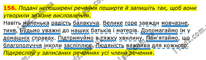 Подані непоширені речення поширте й запишіть так, щоб вони утворили зв’язне висловлення. Навіть маленька радість балакуча. Велике горе завжди мовчазне, тихе. Будьмо уважні до наших батьків і матерів. Допомагаймо їм у домашніх справах. Підтримуймо в тяжку хвилину. Пам'ятаймо, що благополуччя інколи засліплює. Людяність важлива для кожного. Підкресліть у записаних реченнях усі члени речення.
