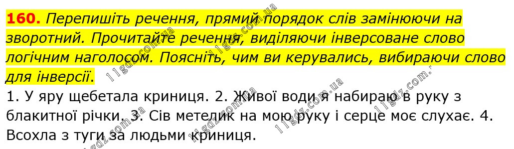 Перепишіть речення, прямий порядок слів замінюючи на зворотний. Прочитайте речення, виділяючи інверсоване слово логічним наголосом. Поясніть, чим ви керувались, вибираючи слово для інверсії. 1. У яру щебетала криниця. 2. Живої води я набираю в руку з блакитної річки. 3. Сів метелик на мою руку і серце моє слухає. 4. Всохла з туги за людьми криниця.