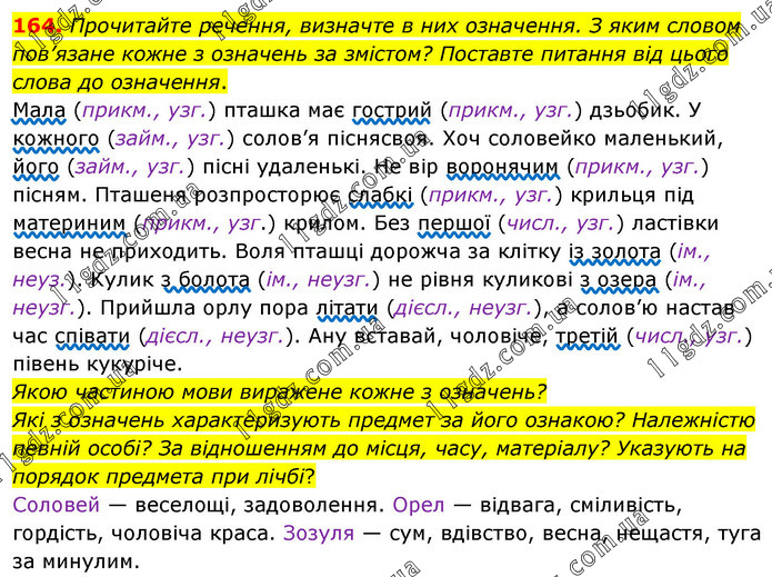 Прочитайте речення, визначте в них означення. З яким словом пов’язане кожне з означень за змістом? Поставте питання від цього слова до означення. Мала (прикм., узг.) пташка має гострий (прикм., узг.) дзьобик. У кожного (займ., узг.) солов’я піснясвоя. Хоч соловейко маленький, його (займ., узг.) пісні удаленькі. Не вір воронячим (прикм., узг.) пісням. Пташеня розпросторює слабкі (прикм., узг.) крильця під материним (прикм., узг.) крилом. Без першої (числ., узг.) ластівки весна не приходить. Воля пташці дорожча за клітку із золота (ім., неуз.). Кулик з болота (ім., неузг.) не рівня куликові з озера (ім., неузг.). Прийшла орлу пора літати (дієсл., неузг.), а солов’ю настав час співати (дієсл., неузг.). Ану вставай, чоловіче, третій (числ., узг.) півень кукуріче. Якою частиною мови виражене кожне з означень? Які з означень характеризують предмет за його ознакою? Належністю певній особі? За відношенням до місця, часу, матеріалу? Указують на порядок предмета при лічбі? Соловей — веселощі, задоволення. Орел — відвага, сміливість, гордість, чоловіча краса. Зозуля — сум, вдівство, весна, нещастя, туга за минулим.