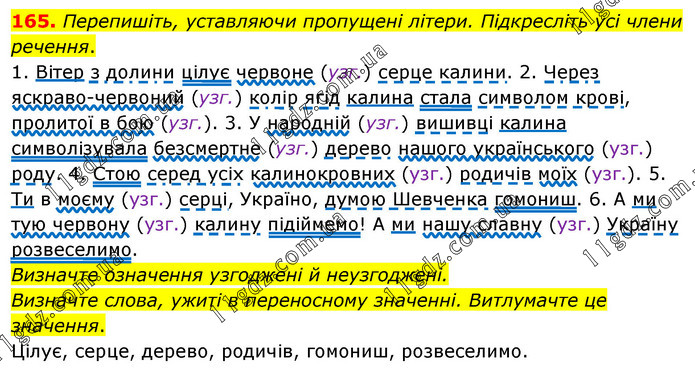 Перепишіть, уставляючи пропущені літери. Підкресліть усі члени речення. 1. Вітер з долини цілує червоне (узг.) серце калини. 2. Через яскраво-червоний (узг.) колір ягід калина стала символом крові, пролитої в бою (узг.). 3. У народній (узг.) вишивці калина символізувала безсмертне (узг.) дерево нашого українського (узг.) роду. 4. Стою серед усіх калинокровних (узг.) родичів моїх (узг.). 5. Ти в моєму (узг.) серці, Україно, думою Шевченка гомониш. 6. А ми тую червону (узг.) калину підіймемо! А ми нашу славну (узг.) Україну розвеселимо. Визначте означення узгоджені й неузгоджені. Визначте слова, ужиті в переносному значенні. Витлумачте це значення. Цілує, серце, дерево, родичів, гомониш, розвеселимо.