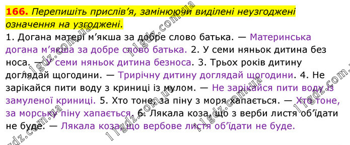 Перепишіть прислів’я, замінюючи виділені неузгоджені означення на узгоджені. 1. Догана матері м’якша за добре слово батька. — Материнська догана м’якша за добре слово батька. 2. У семи няньок дитина без носа. — У семи няньок дитина безноса. 3. Трьох років дитину доглядай щогодини. — Трирічну дитину доглядай щогодини. 4. Не зарікайся пити воду з криниці із мулом. — Не зарікайся пити воду із замуленої криниці. 5. Хто тоне, за піну з моря хапається. — Хто тоне, за морську піну хапається. 6. Лякала коза, що з верби листя об’їдати не буде. — Лякала коза, що вербове листя об’їдати не буде.