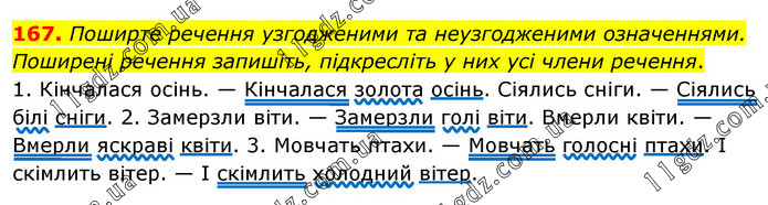 Поширте речення узгодженими та неузгодженими означеннями. Поширені речення запишіть, підкресліть у них усі члени речення. 1. Кінчалася осінь. — Кінчалася золота осінь. Сіялись сніги. — Сіялись білі сніги. 2. Замерзли віти. — Замерзли голі віти. Вмерли квіти. — Вмерли яскраві квіти. 3. Мовчать птахи. — Мовчать голосні птахи. І скімлить вітер. — І скімлить холодний вітер.
