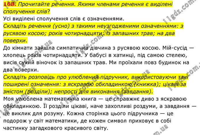 Прочитайте речення. Якими членами речення є виділені сполучення слів? Усі виділені сполучення слів є означеннями. Складіть речення (усно) з такими неузгодженими означеннями: з русявою косою; років чотирнадцяти; із запашних трав; на два поверхи. До кімнати зайшла симпатична дівчина з русявою косою. Мій-сусід — хлопець років чотирнадцяти. У бабусі в хатинці, під самою стелею, висів сухий віночок із запашних трав. Ми проїхали повз будинок на два поверхи. Складіть розповідь про улюблений підручник, використовуючи такі поширені означення: з яскравою обкладинкою (книжка); цікаві за змістом (розділи); непрості для виконання (завдання). Моя улюблена математична книга — це справжнє диво з яскравою обкладинкою. Її розділи цікаві, наче захопливі роздуми, а завдання — це виклик для розуму. Кожна сторінка цього підручника — це подорож у світ математики, де кожен символ приховує в собі частинку загадкового красивого світу.