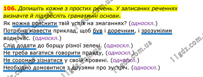 Допишіть кожне з простих речень. У записаних реченнях визначте й підкресліть граматичні основи. Як можна пояснити твій успіх на змаганнях? (односкл.) Потрібно навести приклад, щоб був і доречним, і зрозумілим водночас. (односкл.) Слід додати до борщу різної зелені. (односкл.) Не треба вагатися говорити правду, (односкл.) Не соромно зізнатися у своїй провині. (односкл.) Необхідно домовитися з друзями про зустріч. (односкл.)