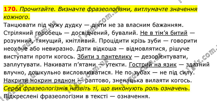 Прочитайте. Визначте фразеологізми, витлумачте значення кожного. Танцювати під чужу дудку — діяти не за власним бажанням. Стріляний горобець — досвідчений, бувалий. Не в тім’я битий — розумний, тямущий, кмітливий. Процідити крізь зуби — говорити неохоче або невиразно. Дати відкоша — відмовлятися, рішуче виступати проти когось. Збити з пантелику — дезорієнтувати, заплутувати. Накивати п’ятами — утекти. Гострий на язик — здатний влучно, дошкульно висловлюватися. Не по зубах — не під силу. Накрити мокрим рядном — раптово, зненацька вилаяти когось. Серед фразеологізмів назвіть ті, що виконують роль означень. Підкреслені фразеологізми в тексті — означення.