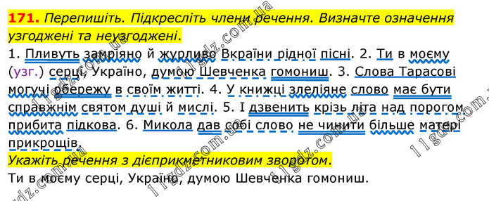 Перепишіть. Підкресліть члени речення. Визначте означення узгоджені та неузгоджені. 1. Пливуть замріяно й журливо Вкраїни рідної пісні. 2. Ти в моєму (узг.) серці, Україно, думою Шевченка гомониш. 3. Слова Тарасові могучі обережу в своїм житті. 4. У книжці злеліяне слово має бути справжнім святом душі й мислі. 5. І дзвенить крізь літа над порогом прибита підкова. 6. Микола дав собі слово не чинити більше матері прикрощів. Укажіть речення з дієприкметниковим зворотом. Ти в моєму серці, Україно, думою Шевченка гомониш.