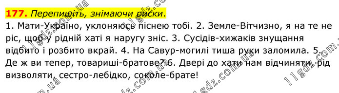 Перепишіть, знімаючи риски. 1. Мати-Україно, уклоняюсь піснею тобі. 2. Земле-Вітчизно, я на те не ріс, щоб у рідній хаті я наругу зніс. 3. Сусідів-хижаків знущання відбито і розбито вкрай. 4. На Савур-могилі тиша руки заломила. 5. Де ж ви тепер, товариші-братове? 6. Двері до хати нам відчиняти, рід визволяти, сестро-лебідко, соколе-брате!