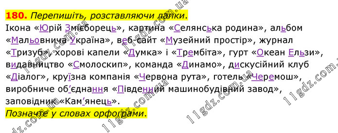 Перепишіть, розставляючи лапки. Ікона «Юрій Змієборець», картина «Селянська родина», альбом «Мальовнича Україна», веб-сайт «Музейний простір», журнал «Тризуб», хорові капели «Думка» і «Трембіта», гурт «Океан Ельзи», видавництво «Смолоскип», команда «Динамо», дискусійний клуб «Діалог», круїзна компанія «Червона рута», готель «Черемош», виробниче об’єднання «Південний машинобудівний завод», заповідник «Кам’янець». Позначте у словах орфограми.