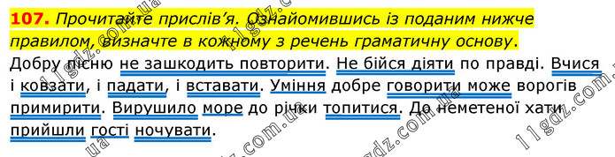 Прочитайте прислів’я. Ознайомившись із поданим нижче правилом, визначте в кожному з речень граматичну основу. Добру пісню не зашкодить повторити. Не бійся діяти по правді. Вчися і ковзати, і падати, і вставати. Уміння добре говорити може ворогів примирити. Вирушило море до річки топитися. До неметеної хати прийшли гості ночувати.