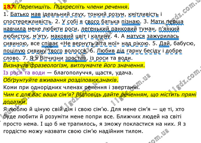 Перепишіть. Підкресліть члени речення. 1. Батько мав ідеальний слух, тонкий розум, кмітливість і спостережливість. 2. У собі я свого батька пізнаю. 3. Мати перша навчила мене любити роси, легенький ранковий тyмaн, п’янкий любисток, м’яту, маковий цвіт і калину. 4. А матуся зажурилась сивиною, все співає «Не вернуть літа мої» над рікою. 5. Дай, бабусю, поцілую сивину твого волосся. 6. Любив дід гарну бесіду і добре слово. 7. Я з Вітчизни зростав, із роси та води. Визначте фразеологізм, витлумачте його значення. Із роси та води — благополуччя, щастя, удача. Обґрунтуйте вживання розділових знаків. Коми при однорідних членах речення і звертанні. Чим є для вас ваша сім’я? Відповідь дайте реченням, що містить прямі додатки. Я люблю й ціную свій дім і свою сім’ю. Для мене сім’я — це ті, хто буде любити й розуміти мене попри все. Ближчих людей на світі просто нема. І що б не трапилось, я зможу покластися на них. Я з гордістю можу назвати свою сім’ю надійним тилом.