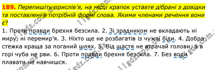 Перепишіть прислів’я, на місці крапок уставте дібрані з довідки та поставлені в потрібній формі слова. Якими членами речення вони є? 1. Проти правди брехня безсила. 2. Зі зрадником не вкладають ні миру, ні перемир’я. 3. Ніхто ще не розбагатів із чужої біди. 4. Добра стежка краща за поганий шлях. 5. Від щастя не втрачай голови, а в горі чуба не рви. 6. Проти правди брехня безсила. 7. Без води плавати не навчишся.