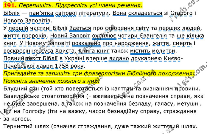 Перепишіть. Підкресліть усі члени речення. Біблія — пам’ятка світової літератури. Вона складається зі Старого і Нового Заповітів. У першій частині Біблії йдеться про створення світу та перших людей, життя пророків. Новий Заповіт охоплює чотири Євангелія та ще кілька книг. У Новому Заповіті розказано про народження, життя, смерть і воскресіння Ісуса Христа. Книга книг також містить молитви. Повний текст Біблії в Україні вперше видано друкарнею Києво-Печерської лаври 1758 року. Пригадайте та запишіть три фразеологізми Біблійного походження. Поясніть значення кожного з них. Блудний син (той хто повертається із каяттям та визнанням провини. Вавилонське стовпотворіння ( вживається на позначення справи, яка не буде завершена, а також на позначення безладу, галасу, метушні. Іти на Голгофу (іти на важку, часом безнадійну справу, страждання за когось. Тернистий шлях (означає страждання, дуже тяжкий життєвий шлях.