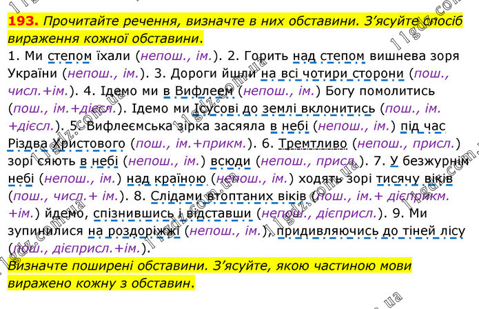 Прочитайте речення, визначте в них обставини. З’ясуйте спосіб вираження кожної обставини. 1. Ми степом їхали (непош., ім.). 2. Горить над степом вишнева зоря України (непош., ім.). 3. Дороги йшли на всі чотири сторони (пош., числ.+ім.). 4. Ідемо ми в Вифлеем (непош., ім.) Богу помолитись (пош., ім.+дієсл.). Ідемо ми Ісусові до землі вклонитись (пош., ім. +дієсл.). 5. Вифлеємська зірка засяяла в небі (непош., ім.) під час Різдва Христового (пош., ім.+прикм.). 6. Тремтливо (непош., присл.) зорі сяють в небі (непош., ім.) всюди (непош., присл.). 7. У безжурнім небі (непош., ім.) над країною (непош., ім.) ходять зорі тисячу віків (пош., числ.+ ім.). 8. Слідами втоптаних віків (пош., ім.+ дієприкм. +ім.) йдемо, спізнившись і відставши (непош., дієприсл.). 9. Ми зупинилися на роздоріжжі (непош., ім.), придивляючись до тіней лісу (пош., дієприсл.+ім.). Визначте поширені обставини. З’ясуйте, якою частиною мови виражено кожну з обставин.