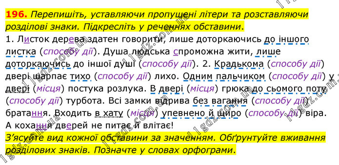 Перепишіть, уставляючи пропущені літери та розставляючи розділові знаки. Підкресліть у реченнях обставини. 1. Листок дерева здатен говорити, лише доторкаючись до іншого листка (способу дії). Душа людська спроможна жити, лише доторкаючись до іншої душі (способу дії). 2. Крадькома (способу дії) двері шарпає тихо (способу дії) лихо. Одним пальчиком (способу дії) у двері (місця) постука розлука. В двері (місця) грюка до сьомого поту (способу дії) турбота. Всі замки відрива без вагання (способу дії) братання. Входить в хату (місця) упевнено й щиро (способу дії) віра. А кохання дверей не питає й влітає! З’ясуйте вид кожної обставини за значенням. Обґрунтуйте вживання розділових знаків. Позначте у словах орфограми.