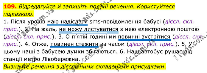 Відредагуйте й запишіть подані речення. Користуйтеся підказкою. 1. Після уроків маю надіслати sms-повідомлення бабусі (дієсл. скл. прис.). 2. На жаль, не можу листуватися з нею електронною поштою (дієсл. скл. прис.). 3. О п’ятій годині ми повинні зустрітися (дієсл. скл. прис.). 4. Отже, повинен стежити за часом (дієсл. скл. прис.). 5. У цьому наші з бабусею думки збігаються. 6. Наш автобус рушає від станції метро Лівобережна. Визначте речення з дієслівними складеними присудками.
