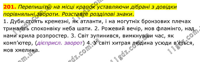 Перепишіть, на місці крапок уставляючи дібрані з довідки порівняльні звороти. Розставте розділові знаки. 1. Дуби стоять кремезні, як атланти, і на могутніх бронзових плечах тримають споконвіку неба шати. 2. Рожевий вечір, мов фламінго, над нами крила розпростер. 3. Світ зупинився, вимкнувши час, як комп’ютер, (дієприсл. зворот) 4. У світі хитрая людина усюди в’ється, мов хмелина.