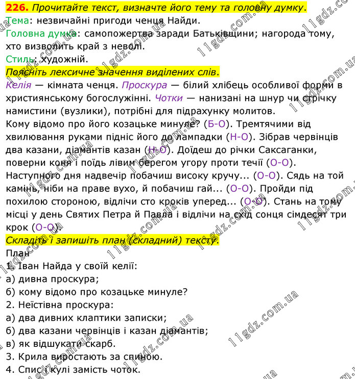 Прочитайте текст, визначте його тему та головну думку. Тема: незвичайні пригоди ченця Найди. Головна думка: самопожертва заради Батьківщини; нагорода тому, хто визволить край з неволі. Стиль: художній. Поясніть лексичне значення виділених слів. Келія — кімната ченця. Проскура — білий хлібець особливої форми в християнському богослужінні. Чотки — нанизані на шнур чи стрічку намистини (вузлики), потрібні для підрахунку молитов. Кому відомо про його козацьке минуле? (Б-О). Тремтячими від хвилювання руками підніс його до лампадки (Н-О). Зібрав червінців два казани, діамантів казан (Н-О). Доїдеш до річки Саксаганки, поверни коня і поїдь лівим берегом угору проти течії (О-О). Наступного дня надвечір побачиш високу кручу... (О-О). Сядь на той камінь, ніби на праве вухо, й побачиш гай... (О-О). Пройди під похилою стороною, відлічи сто кроків уперед... (О-О). Стань на тому місці у день Святих Петра й Павла і відлічи на схід сонця сімдесят три крок (О-О). Складіть і запишіть план (складний) тексту. План 1. Іван Найда у своїй келії: а) дивна проскура; б) кому відомо про козацьке минуле? 2. Неїстівна проскура: а) два дивних клаптики записки; б) два казани червінців і казан діамантів; в) як відшукати скарб. 3. Крила виростають за спиною. 4. Спис і кулі замість чоток.