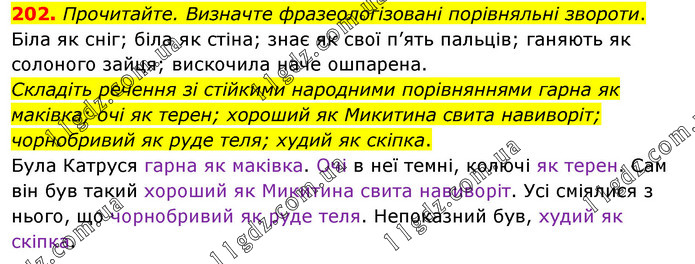 Прочитайте. Визначте фразеологізовані порівняльні звороти. Біла як сніг; біла як стіна; знає як свої п’ять пальців; ганяють як солоного зайця; вискочила наче ошпарена. Складіть речення зі стійкими народними порівняннями гарна як маківка; очі як терен; хороший як Микитина свита навиворіт; чорнобривий як руде теля; худий як скіпка. Була Катруся гарна як маківка. Очі в неї темні, колючі як терен. Сам він був такий хороший як Микитина свита навиворіт. Усі сміялися з нього, що чорнобривий як руде теля. Непоказний був, худий як скіпка.