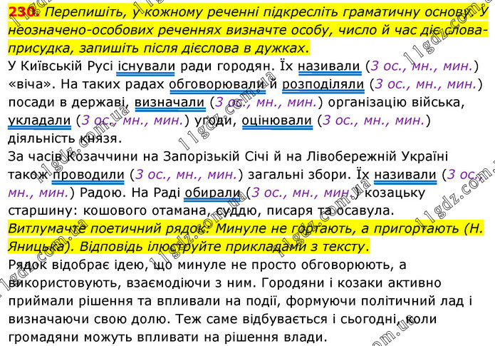 Перепишіть, у кожному реченні підкресліть граматичну основу. У неозначено-особових реченнях визначте особу, число й час діє слова-присудка, запишіть після дієслова в дужках. У Київській Русі існували ради городян. Їх називали (3 ос., мн., мин.) «віча». На таких радах обговорювали й розподіляли (3 ос., мн., мин.) посади в державі, визначали (3 ос., мн., мин.) організацію війська, укладали (3 ос., мн., мин.) угоди, оцінювали (3 ос., мн., мин.) діяльність князя. За часів Козаччини на Запорізькій Січі й на Лівобережній Україні також проводили (3 ос., мн., мин.) загальні збори. Їх називали (3 ос., мн., мин.) Радою. На Раді обирали (3 ос., мн., мин.) козацьку старшину: кошового отамана, суддю, писаря та осавула. Витлумачте поетичний рядок: Минуле не гортають, а пригортають (Н. Яницька). Відповідь ілюструйте прикладами з тексту. Рядок відобрає ідею, що минуле не просто обговорюють, а використовують, взаємодіючи з ним. Городяни і козаки активно приймали рішення та впливали на події, формуючи політичний лад і визначаючи свою долю. Теж саме відбувається і сьогодні, коли громадяни можуть впливати на рішення влади.