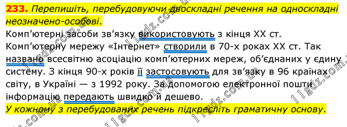Перепишіть, перебудовуючи двоскладні речення на односкладні неозначено-особові. Комп’ютерні засоби зв’язку використовують з кінця XX ст. Комп’ютерну мережу «Інтернет» створили в 70-х роках XX ст. Так названо всесвітню асоціацію комп’ютерних мереж, об’єднаних у єдину систему. З кінця 90-х років її застосовують для зв’язку в 96 країнах світу, в Україні — з 1992 року. За допомогою електронної пошти інформацію передають швидко й дешево. У кожному з перебудованих речень підкресліть граматичну основу.