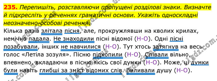 Перепишіть, розставляючи пропущені розділові знаки. Визначте й підкресліть у реченнях граматичні основи. Укажіть односкладні неозначено-особові речення. Кілька разів злітала пісня, але, прокружлявши на кволих крилах, немічно падала. Не знаходили пісні відомої (Н-О). Одні пісні позабували, інших не навчилися (Н-О). Тут хтось затягнув на весь голос «Летіла зозуля». Пісню підхопили (Н-О). Співали вільно, впевнено, вкладаючи в пісню якісь свої думки (Н-О). Може, ці думки були навіть глибші за зміст відомих слів. Виливали душу (Н-О).