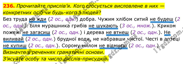 Прочитайте прислів’я. Кого стосується висловлене в них — конкретних осіб чи будь-кого з людей? Без труда не жди (2 ос., одн.) добра. Чужим хлібом ситий не будеш (2 ос., одн.). Біля мурашника грибів не шукають (3 ос., множ.). Криком пожежі не загасиш (2 ос., одн.) і дерева не втнеш (2 ос., одн.). Не виливай (2 ос., одн.) брудної води, не набравши чистої. Честі в аптеці не купиш (2 ос., одн.). Сорому милом не відмиєш (2 ос., одн.). Визначте в реченнях граматичні основи. З’ясуйте особу та число дієслів-присудків.