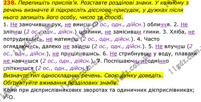 Перепишіть прислів’я. Розставте розділові знаки. У кожному з речень визначте й підкресліть дієслово-присудок, у дужках після нього запишіть його особу, число та спосіб. 1. Не замочивши рук, не вмиєш (2 ос., одн., дійсн.) обличчя. 2. Не зліпиш (2 ос., одн., дійсн.) цеглини, не замісивши глини. 3. Хліба, не потрудившись, не матимеш (2 ос., одн., дійсн.). 4. Часто оглядаючись, далеко не заїдеш (2 ос., одн., дійсн.). 5. Не влучиш (2 ос., одн., дійсн.), не прицілившись. 6. Не стрибнувши у воду, плавати не навчишся (2 ос., одн., дійсн.). 7. Поспішаючи, неодмінно спіткнешся (2 ос., одн., дійсн.). Визначте тип односкладних речень. Свою думку доведіть. Обґрунтуйте вживання розділових знаків. Коми при дієприслівникових зворотах та одиничних дієприслівниках; У-О.
