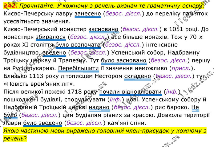 Прочитайте. У кожному з речень визнач те граматичну основу. Києво-Печерську лавру занесено (безос. дієсл.) до переліку пам’яток усесвітнього значення. Києво-Печерський монастир засновано (безос. дієсл.) в 1051 році. До монастиря збиралося (безос. дієсл.) все більше монахів. Тож у 70-х роках XI століття було розпочато (безос. дієсл.) інтенсивне будівництво, зведено (безос. дієсл.) Успенський собор, Надбрамну Троїцьку церкву й Трапезну. Тут було засновано (безос. дієсл.) першу на Русі друкарню. Перебільшити її значення неможливо (присл.). Близько 1113 року літописцем Нестором складено (безос. дієсл.) тут «Повість врем’яних літ». Після великої пожежі 1718 року почали відновлювати (інф.) пошкоджені будівлі, споруджувати (інф.) нові. Успенському собору й Надбрамній Троїцькій церкві надано (безос. дієсл.) рис бароко. Не було (безос. дієсл.) цим будівлям рівних за красою. Довкола території Лаври було зведено (безос. дієсл.) кам'яні стіни. Якою частиною мови виражено головний член-присудок у кожному з речень?