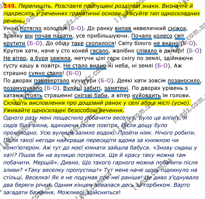 Перепишіть. Розставте пропущені розділові знаки. Визначте й підкресліть у реченнях граматичні основи. З’ясуйте тип односкладних речень. Уночі потягло холодом (Б-О). До ранку випав невеличкий сніжок. Зранку він почав падати, усе прибільшуючи. Почало колесо світ крутити (Б-О). До обіду таке схопилося! Світу білого не видно (Б-О). Кругом хати, наче у сто коней гасало, жалібно співало в димарі! (Б-О) Не вітер, а буря завіяла, метучи цілі гори снігу по землі, здіймаючи густу кашу в повітрі. Не стало видно ні неба, ні землі (Б-О). Аж страшно сумно стало! (Б-О) По дворах понавертало кучугури (Б-О). Деякі хати зовсім позаносило, позамурувало (Б-О). Вулиці забиті, заметені. По дворах урівень з хатами стоять страшенні снігові баби, а вітер куйовдить їм голови. Складіть висловлення про дощовий ранок у селі або в місті (усно). Уживайте односкладні безособові речення. Одного разу мені пощастило побачити веселку. Було це влітку. Я сидів біля вікна, вдихаючи свіже повітря. Після дощу було прохолодно. Усю вулицю залило водою. Пройти ніяк. Нічого робити. Після такої негоди найкраще пересидіти вдома за книжкою чи комп’ютером. Аж тут до моєї кімнати зайшла бабуся. «Знову сидиш у хаті? Пішов би на вулицю погратися. Ще й красу таку можна там побачити. Мерщій». Дивно. Що такого гарного можна побачити після зливи? «Таку веселку пропустиш!» Тут мене наче щось підкинуло на стільці. Веселка! Як я не подумав про неї раніше! Це диво з’єднувало два береги річки. Одним кінцем ховалася десь за горбиком. Варто загадати бажання. Можливо, здійсниться!