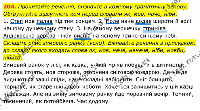 Прочитайте речення, визначте в кожному граматичну основу. Обґрунтуйте відсутність ком перед словами як, мов, наче, ніби. 1. Степ мов палав під тим сонцем. 2. Поле наче додає широти й волі нашому душевному стану. 3. На самому вершечку стриміла Андріївська церква і ніби висіла на ясному темно-синьому небі. Складіть опис зимового ранку (усно). Вживайте речення з присудком, до складу якого входять слова як, мов, наче, неначе, ніби, мовби, нібито. Зимовий ранок у лісі, як казка, у якій мріяв побувати в дитинстві. Дерева стоять, мов сторожа, огорнена сніговою ковдрою. Де-не-де видніються заячі сліди, наче складні лабіринти. Сніг блищить, порипує, як старенькі дідові чоботи. Хочеться залишитись у цій казці назавжди. Але на зміну зимовому ранку йде морозний вечір. Темний, таємничий, як потойбіччя. Час додому.